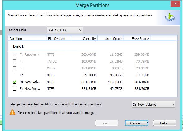 ५. अब तपाइलाई D: र E: जोड्नु छ भने D: मा सेलेक्ट गर्नुहोस र right click गर्नुहोस | तपाइले त्यहाँ merge partition भन्ने अप्सन देख्नुहुने छ सो Merge partition मा क्लिक गर्नुहोस | त्यसपछी तपाइले यस्तो स्क्रीन देख्न सक्नुहुनेछ |